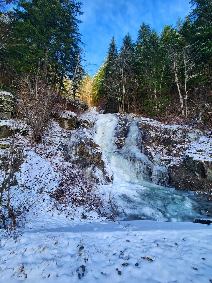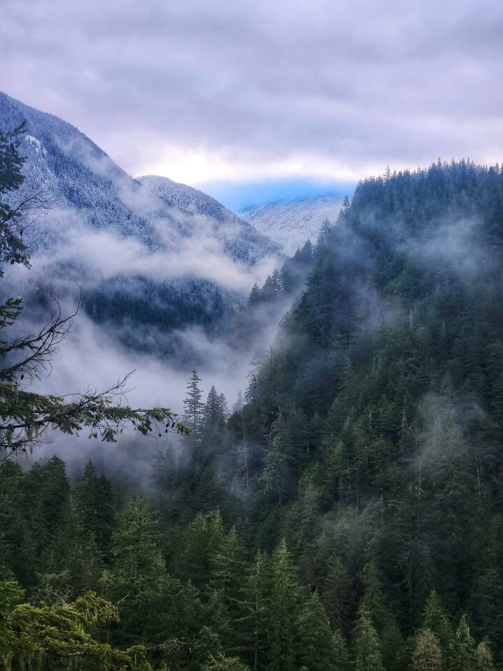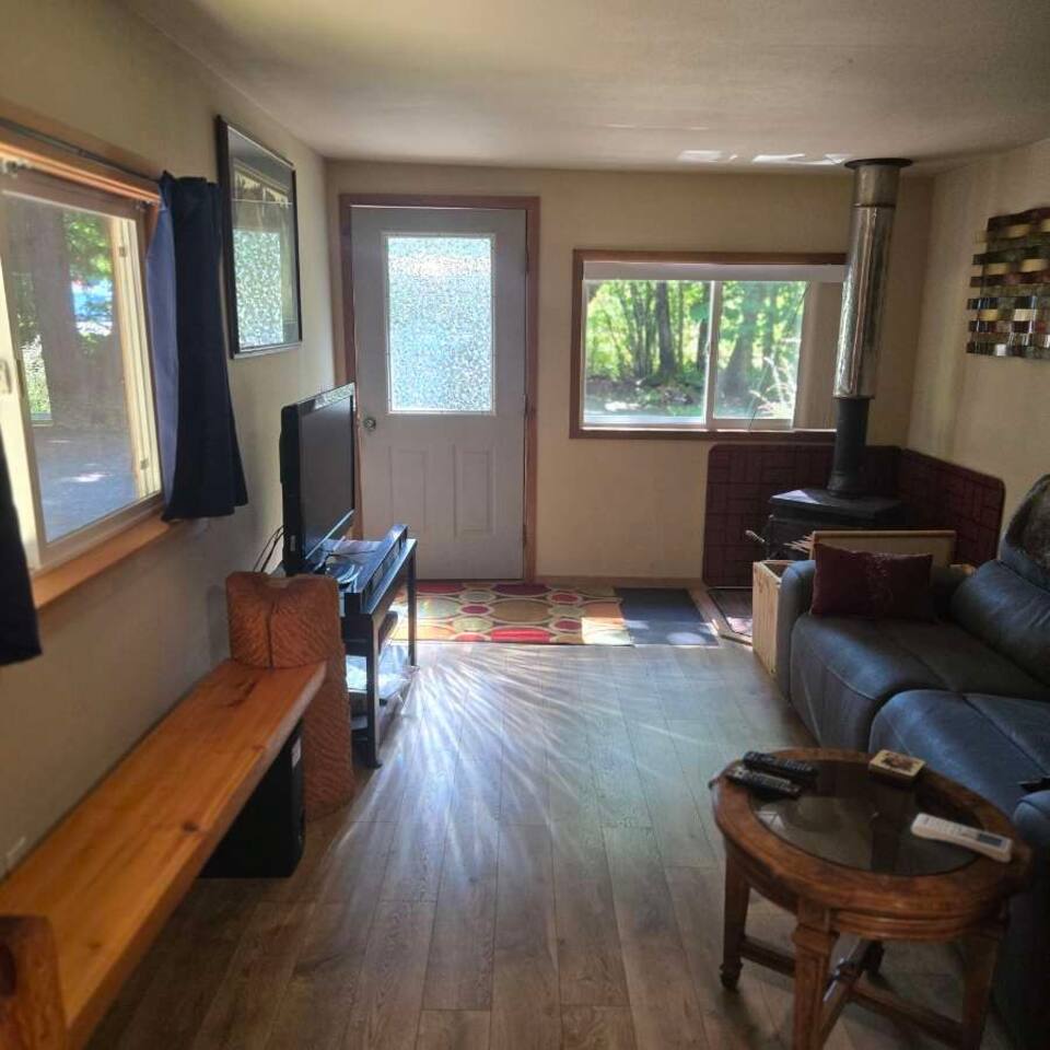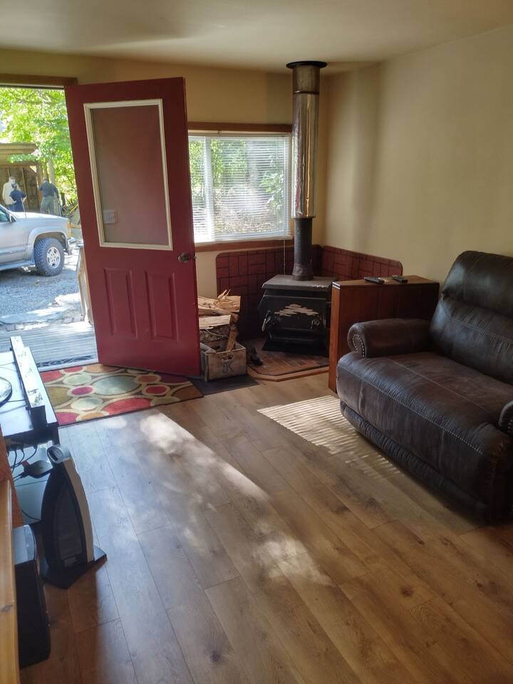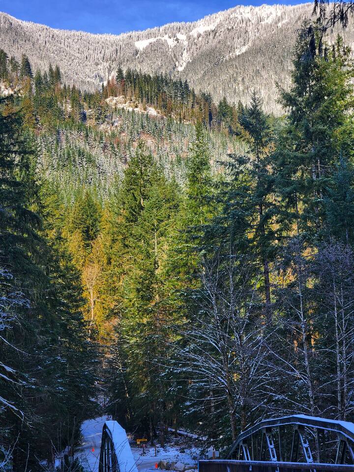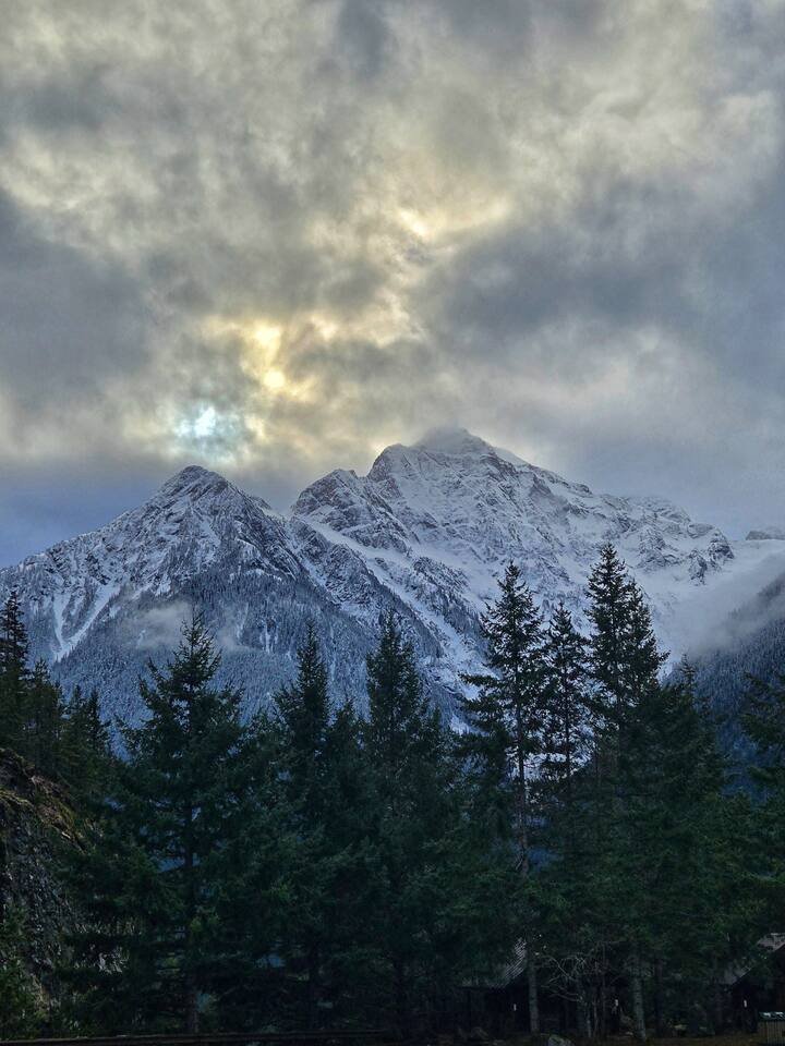 The best of both worlds; high speed internet close to the best trail heads in the North Cascades National Park. With room enough for two, this little cabin has space for your hiking and climbing gear and a full kitchen to accommodate all your cooking needs. Snuggle up inside with the wood burning stove in the winter and enjoy a powerful air conditioner in the summer. Relax after a trip to Lake Diablo with a movie or your next great read in your own private cabin with a quick walk to restaurants!