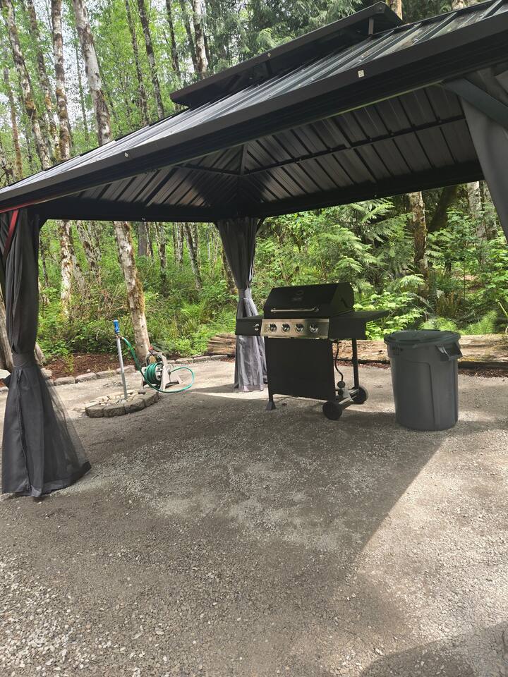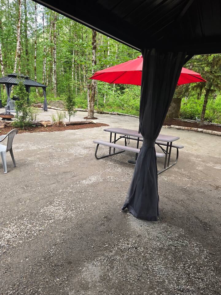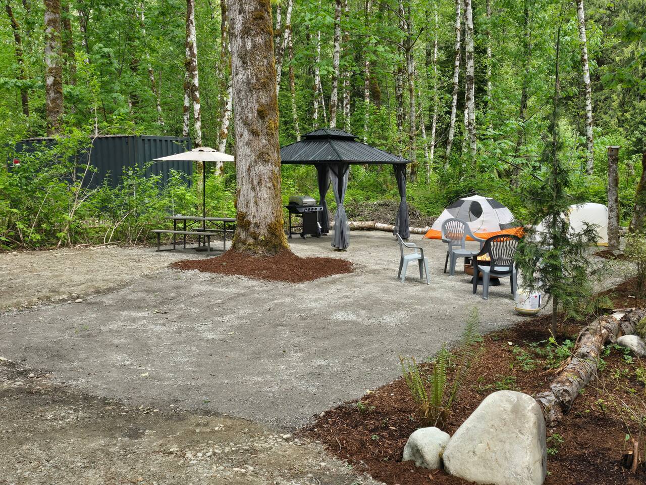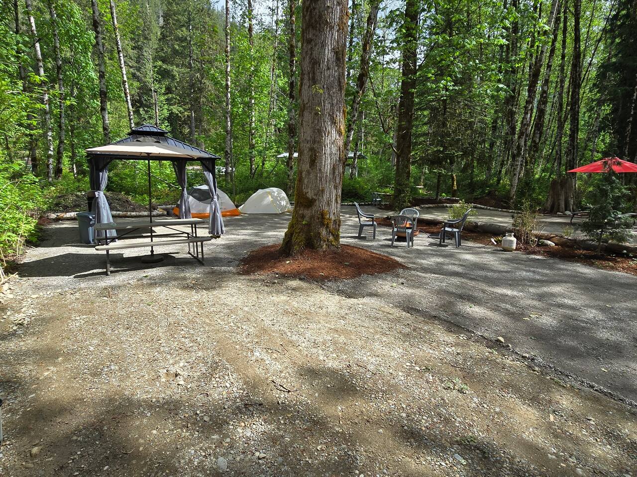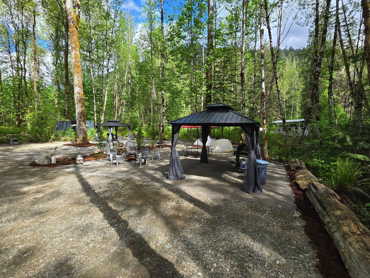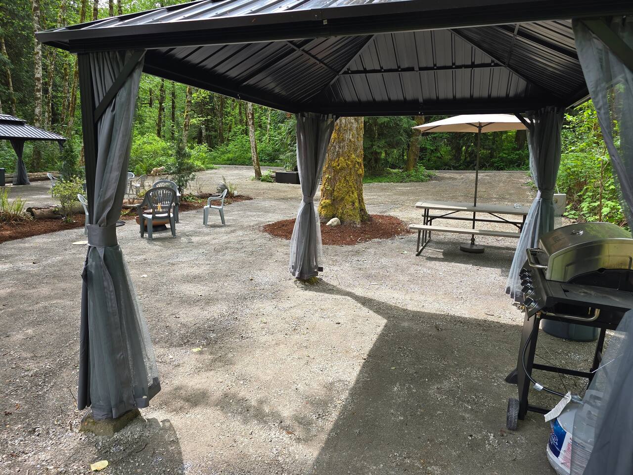 Two curtained, hard topped gazebos to screen sun or for privacy, propane grill, propane and wood fire circles, picnic tables, chairs, soft tent pads and mature trees are features of this super convenient camping location.