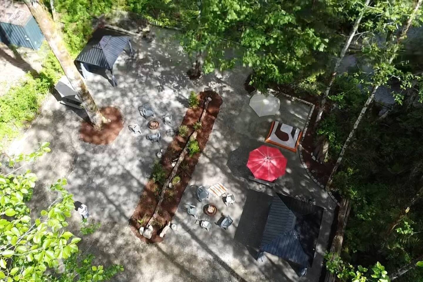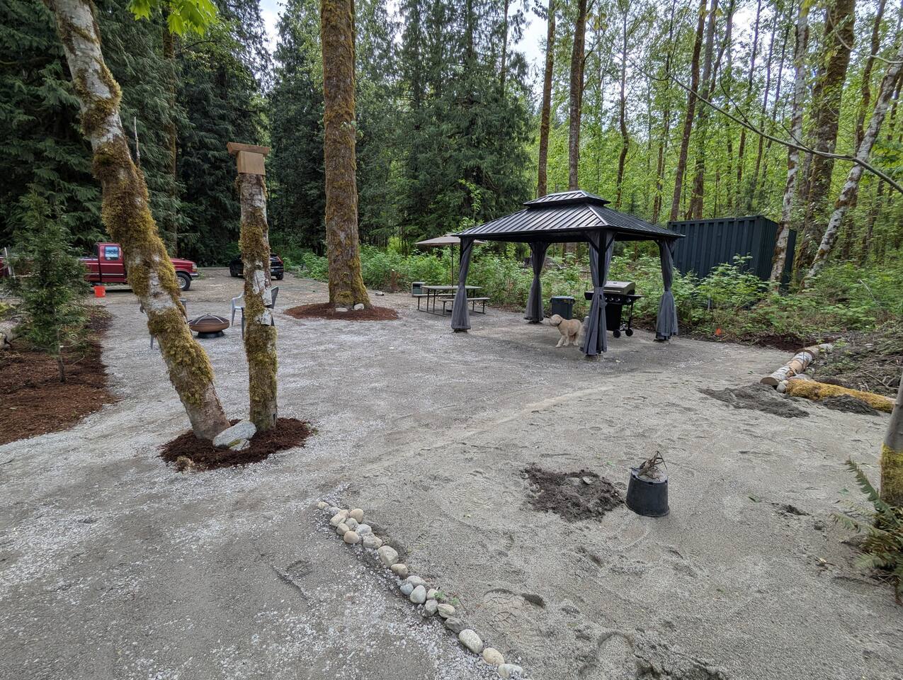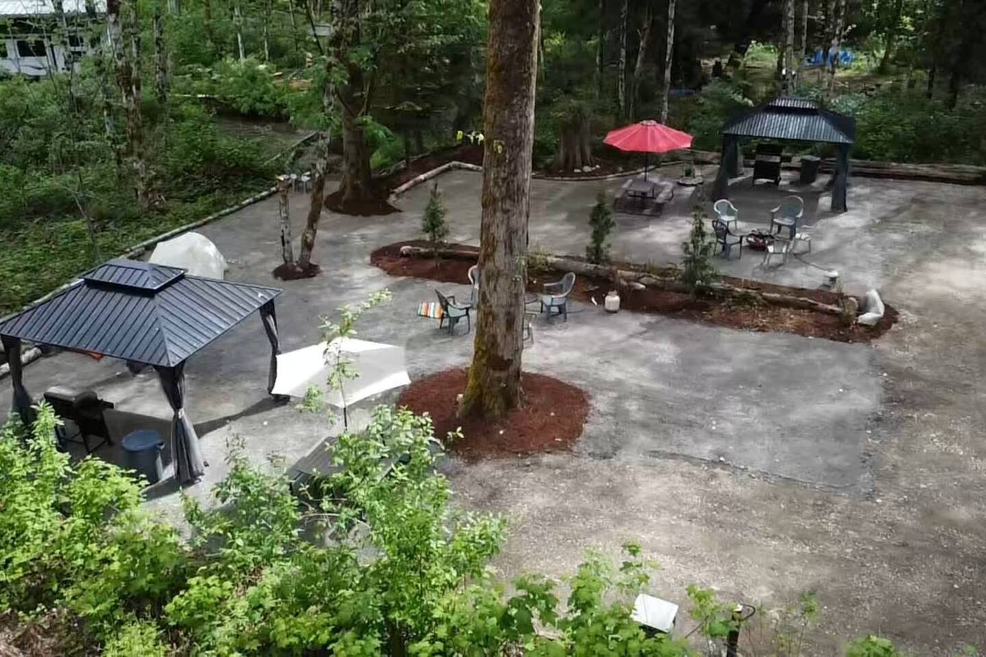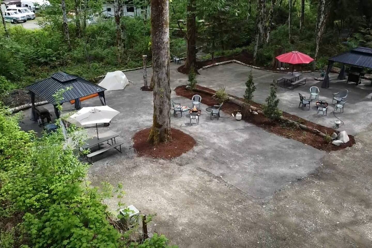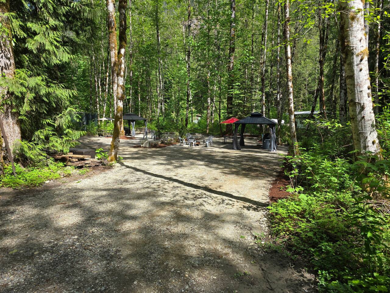 Two curtained, hard topped gazebos to screen sun or for privacy, propane grill, propane and wood fire circles, picnic tables, chairs, soft tent pads and mature trees are features of this super convenient camping location.